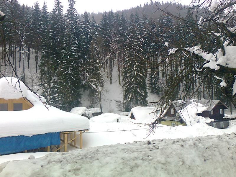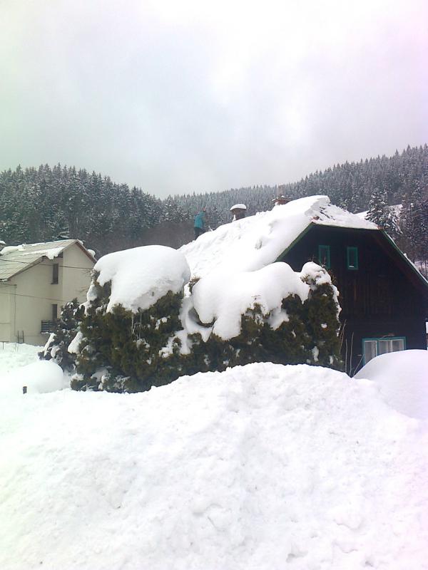 Předpověď počasí z brněnského pracoviště Českého hydrometeorologického ústavu přitom hovoří o možnosti deště a smíšených srážek, místní z toho rozhodně radost nemají. „Zdaleka není v mých silách odházet celou metrovou vrstvu sněhu, ale z deště mám skutečně obavy, musím zbavit sněhu především okrajové části střechy, kde je zátěž na krovy největší," komentuje situaci v krátké přestávce při odpočinku přímo na střeše dřevěnice Aleš Gelnar.