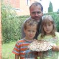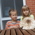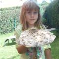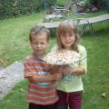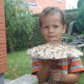 Přímo na zahradě se děti mohou pochlubit úžasnou bedlou, však bydlí jen kousek od lesa. Tatínek hned vzal na houbového obra přesný metr. V průměru měl klobouk udivujících 29 centimetrů. Opravdový unikát.