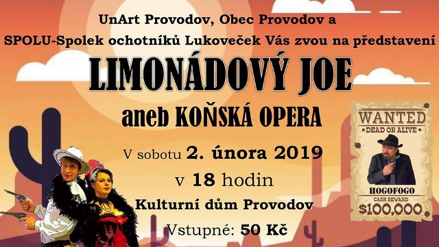 Pamatujete? Správně, to je on, mého srdce šampion. Limonádový Joe. Jednu z nejslavnějších českých filmových komedií, kde pijí praví muži pouze kolalokovu lihuprostou limonádu a zákon má podobu pistolníka, vybaveného přesnou muškou, zářivým úsměvem a nebeským tenorem, zpracovali pro divadelní prkna po zlínském divadle také ochotníci. Oblíbené hlášky i písničky zazní v podání Spolku ochotníků Lukoveček již tuto sobotu v Kulturním domě Provodov. Vstupné je 50 Kč.