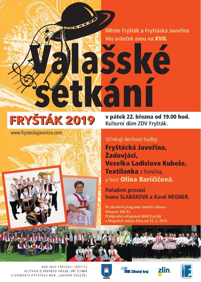 Fryštácká Javořina zve na XVII. ročník oblíbené hudební akce Valašské setkání. 22. března od 19 hodin v sálu Kulturního domu ZDV Fryšták zahrají Fryštácká Javořina, Žadovjáci, Veselka Ladislava Kubeše, Textilanka z Trenčína a host Olina Baričičová.