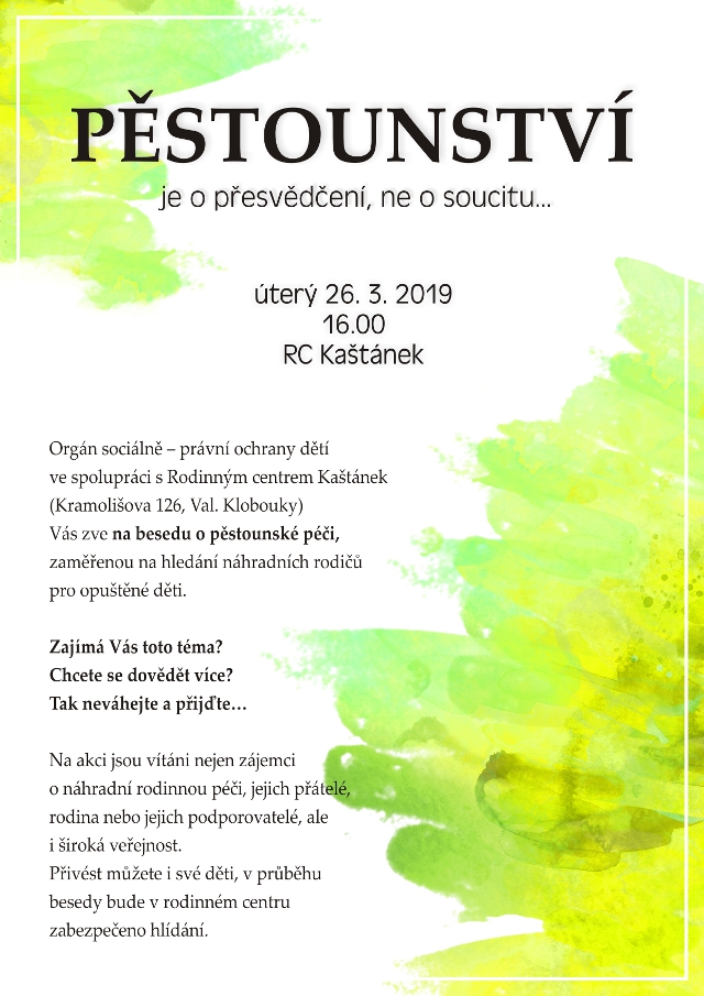 Lidé, kteří přemýšlejí, že by mohli do své rodiny přijmout opuštěné dítě, budou mít v rámci besedy příležitost prodiskutovat všechna pro a proti, která je v této souvislosti napadají. Na dotazy budou odpovídat psycholožka Markéta Šobáňová a sociální pracovnice Jana Surmařová. Akci pořádá orgán sociálně-právní ochrany dětí Městského úřadu Valašské Klobouky.