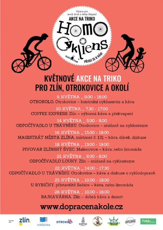 V úterý 21. května je přichystaná snídaně na odpočívadle u cyklostezky v Loukách. „Dobrou kávu a dezert si mohou soutěžící vychutnat 28. května ve zlínské Bajkavárně,“ řekl Dvořák. Podle něj se do akce zapojila řada zaměstnanců města a jeho organizací. „Snaží se jít příkladem a nepodílet se na zahušťování automobilové dopravy,“ uzavřel mluvčí.