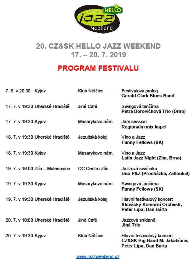 Festival letos od středy 17. července do soboty 20. července nabídne osvědčené, volně přístupné koncerty v Uherském Hradišti, Kyjově a Zlíně-Malenovicích a samozřejmě dva hlavní festivalové koncerty v Jezuitské koleji v Hradišti a v Klubu Nětčice v Kyjově.