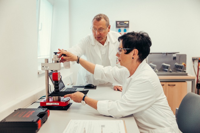 „Jsme schopni posoudit, jestli se materiál hodí nebo nehodí na pokročilou obuv. Také například zkoušíme vhodnost povrchové úpravy obuvních materiálů z pohledu odolnosti vůči opakovanému ohybu, a to jak za běžných teplot, tak také teplot až do mínus 25 stupňů Celsia,“ popisuje Luděk Suchomel, technolog centra s více než třicetiletou praxí ve zkušebnictví.